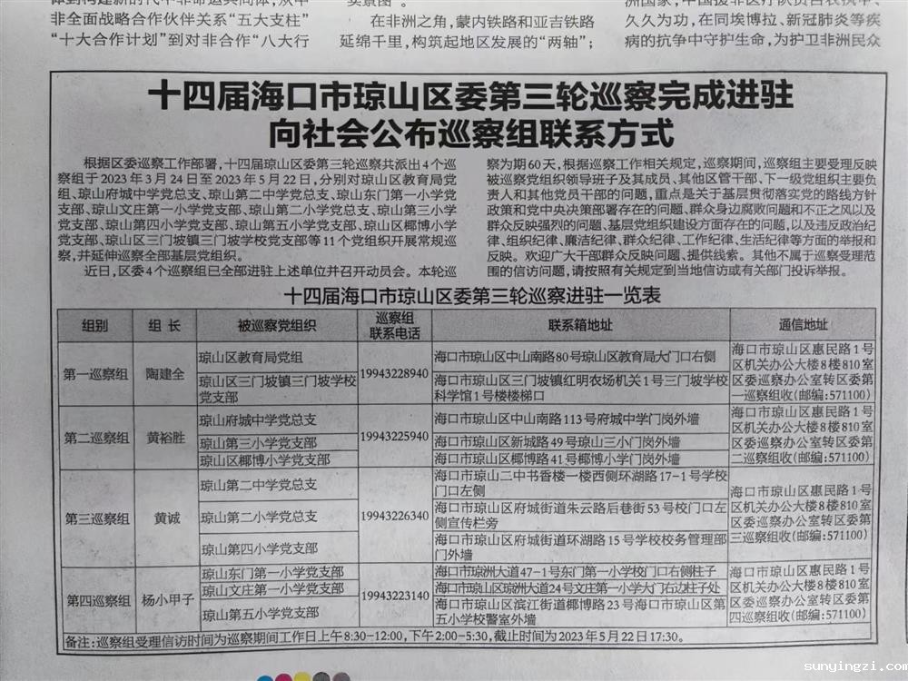 十四届琼山区委第三轮巡察第四巡察组巡察向社会公布巡察组联系方式